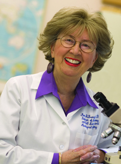 As a young girl growing up in the woods of Connecticut, Mary used to row her little leaky row boat along a stream looking at the tadpoles in the water.  Her curiosity peaked, wondering how tadpoles develop into frogs?  Later, she began taking biology classes in school and loved the single cell animals that she was assigned to draw.  Becoming enthralled, she decided that biology was the career for her.  1st defining moment.  After high school at Northfield School for Girls, she attended Simmons College to earn her Bachelors of Science degree.  While there, she took a summer course at Jackson Laboratories in Bar Harbor that changed the course of her life. One day she put rabbit heart muscle into tissue culture and days later saw it still beating.  2nd defining moment.  Mary graduated in 1953 and went on to the University of Wisconsin (UW) to earn her Master’s and Doctoral degrees.  At UW, her Master’s mentor was Dr. Robert Schilling; they studied intrinsic factor in gastric juice and its role in binding vitamin B12.  “I saw him recently.  He’s now 90 years old, still working.  He said that our papers published in 1956 and 1957 are still highly regarded.”  But Mary wasn’t really interested in intrinsic factor and pernicious anemia.  She had taken a course in cell biology with a prominent cell biologist, Dr. Hans Ris, and had looked at images in the electron microscope.  3rd defining moment.  “We were using one of the first electron microscopes in the United States; we had to hammer the lenses into place.  But still, the images were so captivating.”  This led her to decide to work towards the PhD degree with Dr. Ris.