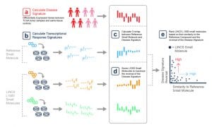 a. A Disease Signature is calculated by identifying the Differentially Expressed Genes between tumor samples and same-tissue controls.b. Transcriptional Consensus Signatures (TCS) are calculated for a reference small molecule and the LINCS L1000 Small Molecules.c. The overlap between the Reference TCS and the disease signature is calculated.d.The LINCS L1000 Small Molecules are ranked as to maximize the reversal of the Disease Signature.e. The LINCS L1000 Small Molecules are plotted based on their similarity against the Reference small molecule and the reversal of the Disease Signature.From Stathias, Jermakowicz, et al., Nature Communications, 2018.